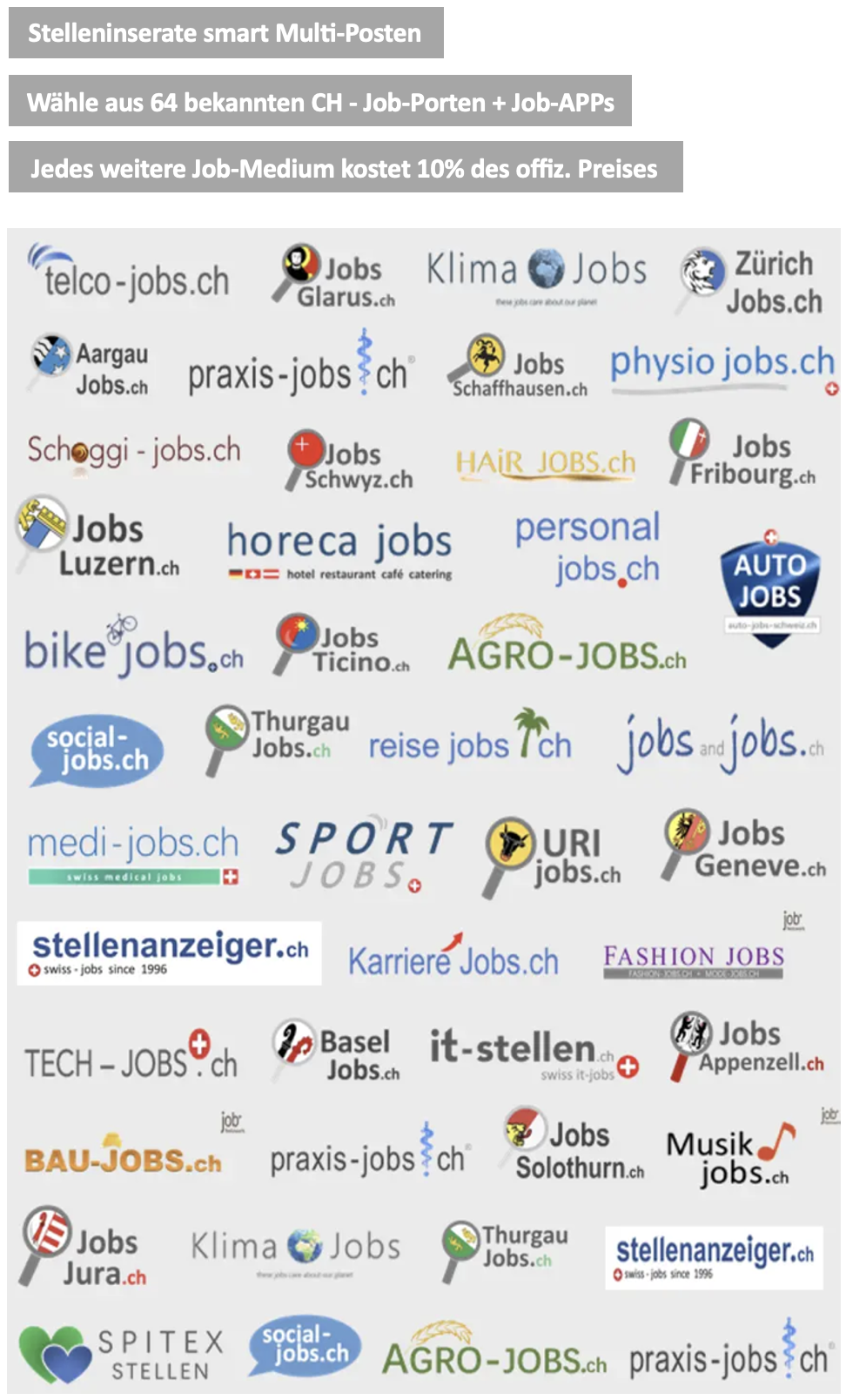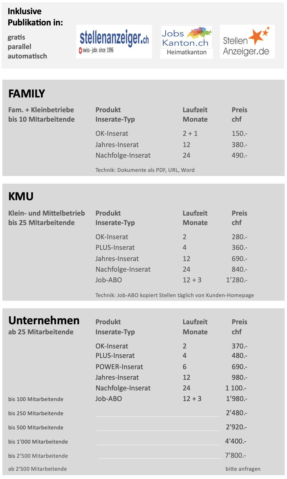 Betriebe bis 10 Mitarbeitende, alle Stellen-Inserate ab 580.- CHF im Jahr